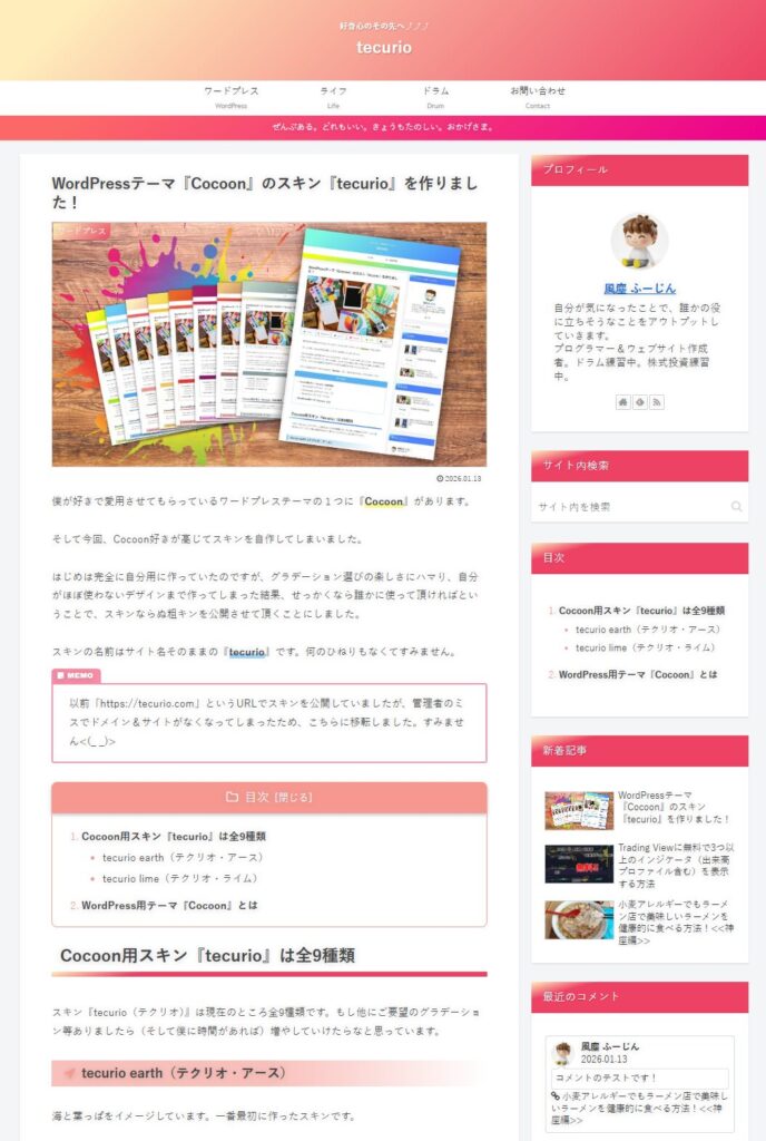 スキン『tecurio(テクリオ)』は現在のところ全9種類です。もし他にご要望のグラデーション等ありましたら(そして僕に時間があれば)増やしていけたらなと思っています。