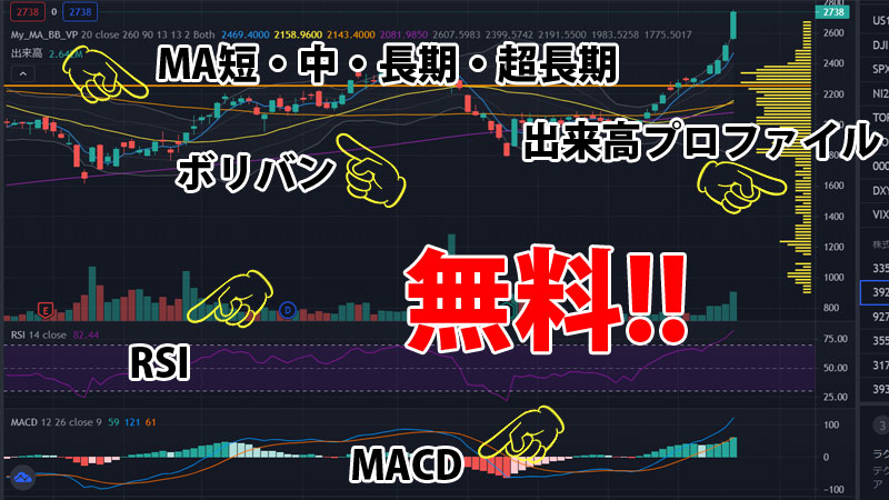 これで無料アカウントで、TradingViewに移動平均線、ボリンジャーバンド、出来高プロファイル、RSI、MACDが表示できるようになりました