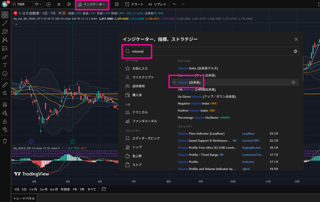 画面の上部にある「インジケーター」をクリックし、検索ボックスに「volume」と入力すると、「Volume(出来高)」というインジケーターが表示されます。それをクリックするとチャートに出来高が表示されるようになります。