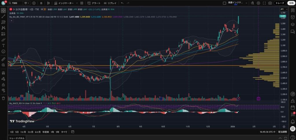 移動平均線ボリンジャーバンド出来高プロファイルの3つが表示されます。