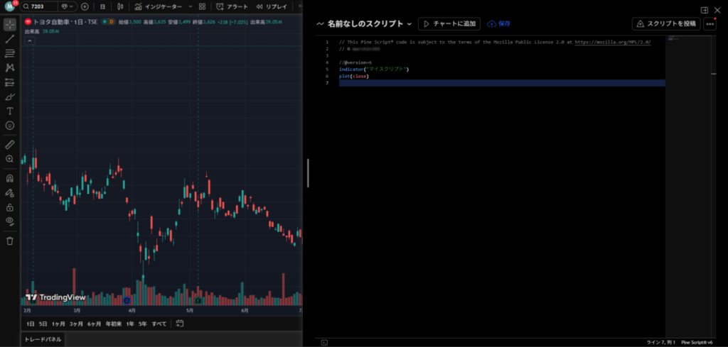 そして↓のコードを「//@version=6」の下に張り付けます。