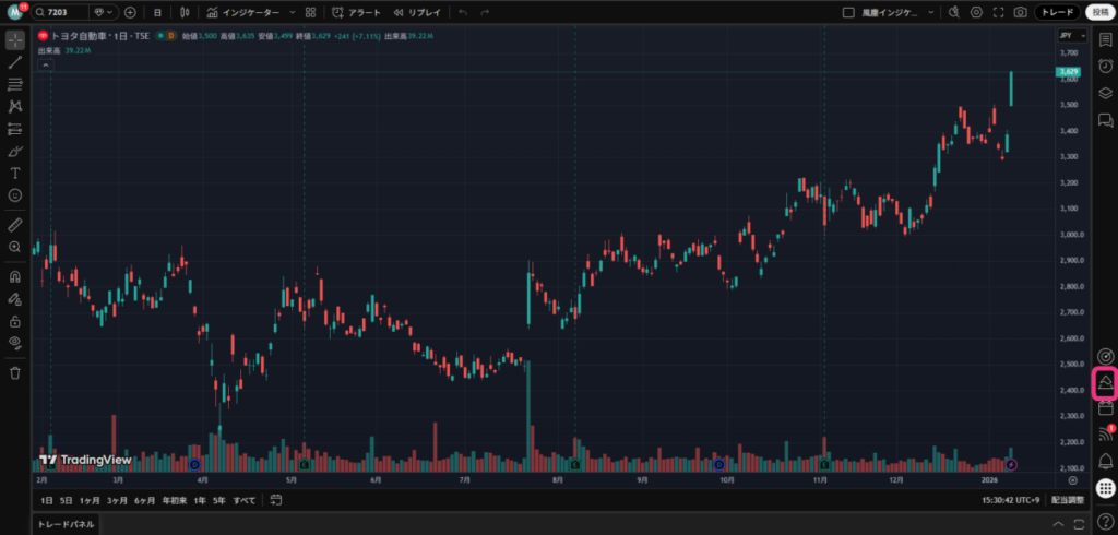 初期設定で表示されているかもしれませんが、出来高が表示されないよ!という方のために出来高の表示方法も書いておきます。