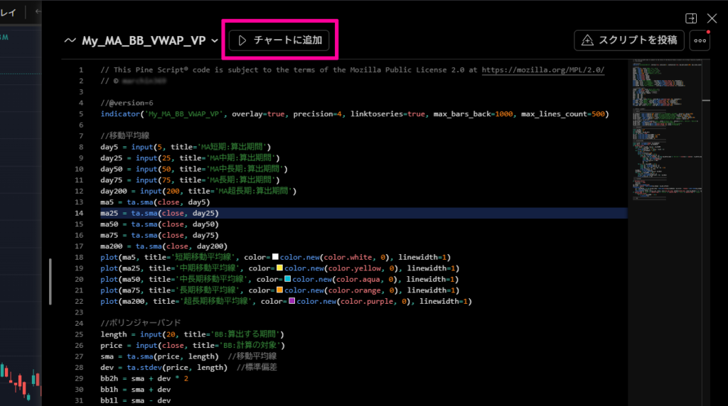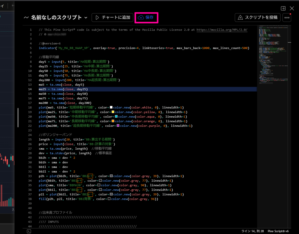 「保存」→好きなスクリプト名を入力→「保存」→「チャートに追加」とクリックします。