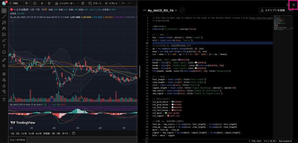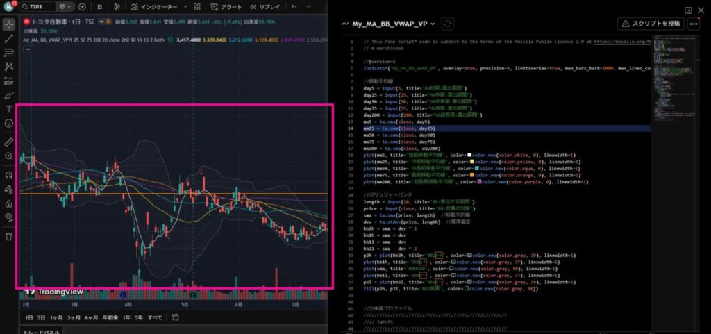でもそこは太っ腹の「Trading View」様。インジケータを自作すれば、移動平均線(短期・中期・長期・超長期)、ボリンジャーバンド、RSI、MACD、出来高プロファイル(固定期間)を同時に表示できる道を残してくださっています(感謝です<(__)>)。