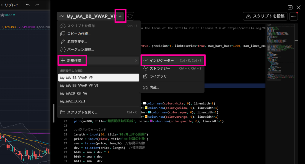 スクリプト名の右にある「∨」→「新規作成」→「インジケーター」の順にクリックします。